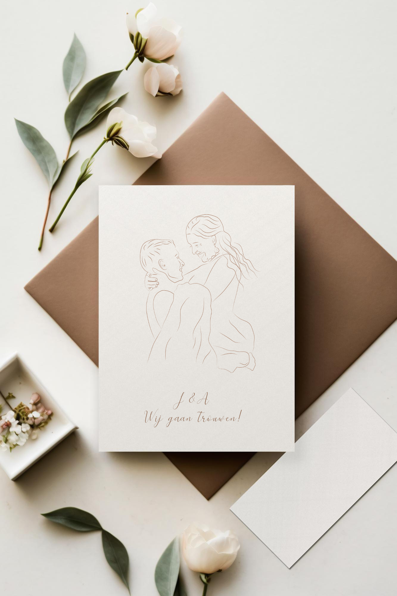 Een lijntekening van jullie samen op de trouwkaart: stijlvol, uniek en persoonlijk!